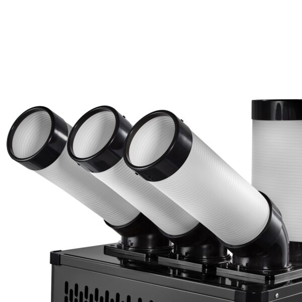 В кондиционерах реализовано 3D распределение воздушного потока благодаря гибким патрубкам выполненным из плотного ABS пластика. Каждый из них может быть доукомплектован перфорированным воздухораспределительным рукавом, длиной до 5 метров, обеспечивая полное покрытие помещения.